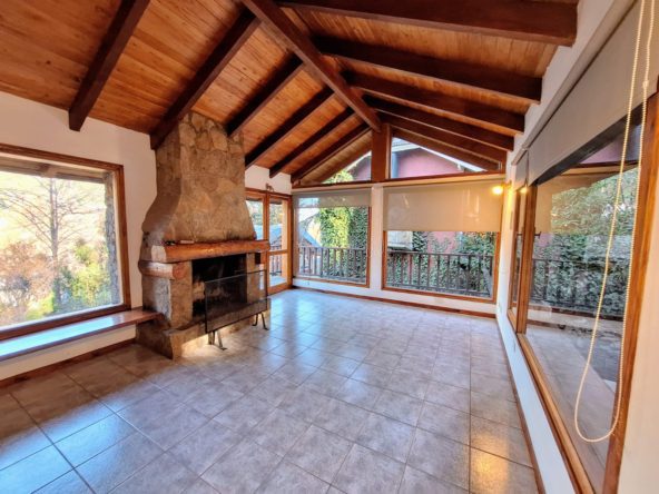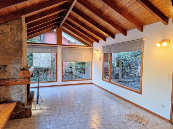 Living con hogar a leña y amplios ventanales con vistas al bosque.