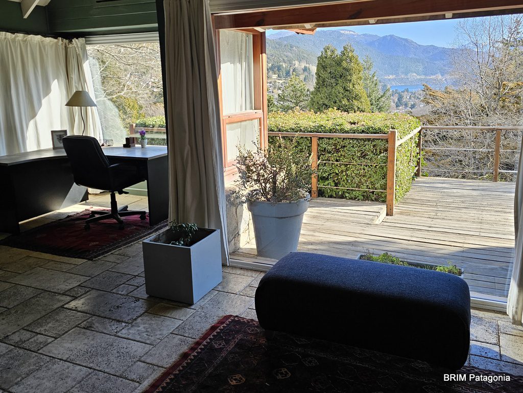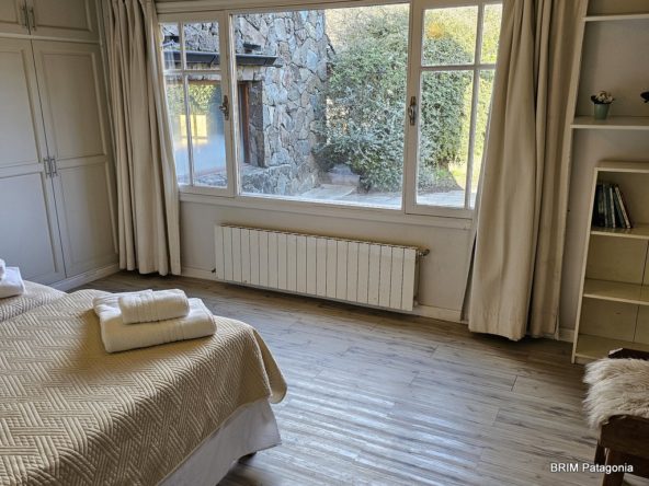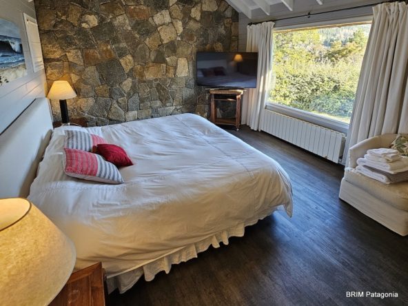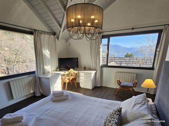 - Dormitorio principal con hogar a leña en piedra y baño en suite. Aire acondicionado. Tiene un vestidor con amplios placares. (todo con la magnífica vista al lago !!)